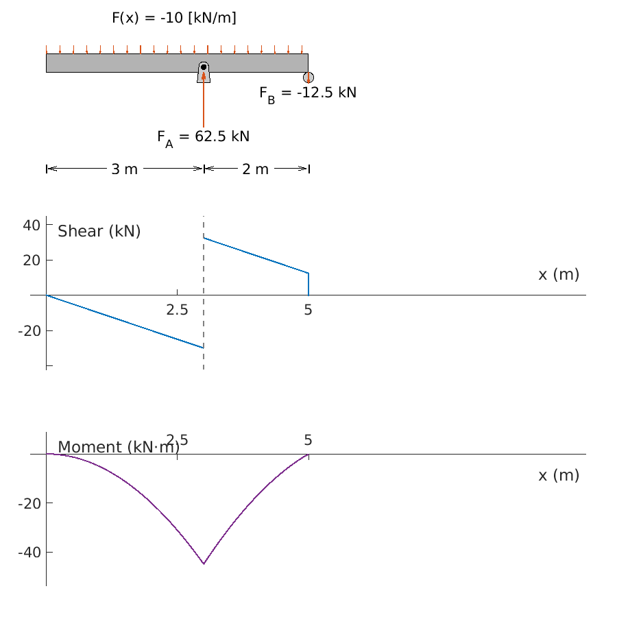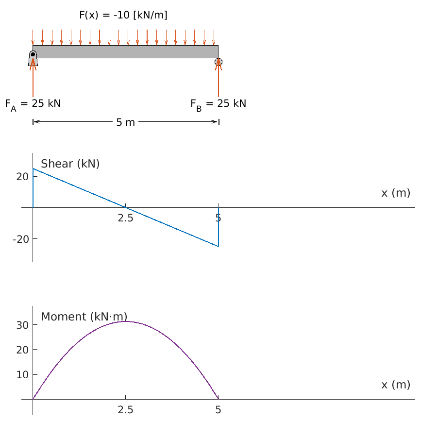 Running SmokeTests >> Running BeamBending.mlx sol = struct with fields: F_A: 20/3 F_B: 16/3 ans = 6.6667 ans = 5.3333 eqF = F_A + F_B - 50 == 0 eqM = 5*F_B - 125 == 0 FA = 25 FB = 25 S(x) = 25 - 10*x M(x) = -5*x*(x - 5) f = 15*([kN]/[m]) L = 11*[m] pF = 165*[kN] pF = (30000000000000000/808767566411)*[lbf] ans = 37093.0*[lbf] M(x) = - 5*x^2 + 25*x xcrit = 5/2 Mmax = (125/4)*[kN]*[m] I = 20000*[cm]^4 y = (-1/10)*[m] sigma = (1/6400)*(([kN]*[m]^2)/[cm]^4) sigma = (125/8)*[MPa] ans = 15.625*[MPa] [Terse] Diagnostic logged (2025-09-29 19:32:40): Figure saved to: --> /tmp/1cbcc663-c76a-459b-80a1-f9366fd58957/Figure_554bcb22-aa07-4933-87bc-27dabc31fbf3.png [Terse] Diagnostic logged (2025-09-29 19:32:42): Figure saved to: --> /tmp/1cbcc663-c76a-459b-80a1-f9366fd58957/Figure_93e593f5-b120-440f-bad8-c22f0f660461.png .>> Running BeamDeflection.mlx FA = 600000 MA = 1800000 s(x) = 600000 - 100000*x M(x) = - 50000*x*(x - 12) - 1800000 I = 9/10000 deq(x) = diff(v(x), x, x) == - (x*(x - 12))/3600 - 1/100 vsol = - x^4/43200 + x^3/1800 - x^2/200 FA = 25000 FB = 25000 M(x) = -5000*x*(x - 5) I = 1/10000 vsol = -(x*(x^3 - 10*x^2 + 125))/4800 v(x) = -(x*(x^3 - 20*x^2 + 1000))/31250 [Terse] Diagnostic logged (2025-09-29 19:32:46): Figure saved to: --> /tmp/1cbcc663-c76a-459b-80a1-f9366fd58957/Figure_d3212277-9f8a-45ad-bf29-d582d0eb3c74.png [Terse] Diagnostic logged (2025-09-29 19:32:47): Figure saved to: --> /tmp/1cbcc663-c76a-459b-80a1-f9366fd58957/Figure_5e6640c4-48bb-42bc-a73f-9893c80c2c11.png . Done SmokeTests __________ Running SolnSmokeTests ..>> Running BeamBendingSoln.mlx eq1 = x + 4*y == 3 eq2 = 3*x - 2*y == 6 ans = struct with fields: x: 15/7 y: 3/14 sol = struct with fields: F_A: 20/3 F_B: 16/3 ans = 6.6667 ans = 5.3333 FA = -40 FB = 80 f(x) = x^2 - 1 intVal = 12 F(x) = (x*(x^2 - 3))/3 eqF = F_A + F_B - 50 == 0 eqM = 5*F_B - 125 == 0 FA = 25 FB = 25 S(x) = 25 - 10*x M(x) = -5*x*(x - 5) FA = 12.5000 FB = 25 S(x) = 25/2 - (3*x^2)/2 M(x) = -(x*(x^2 - 25))/2 f = 15*([kN]/[m]) L = 11*[m] pF = 165*[kN] pF = (30000000000000000/808767566411)*[lbf] ans = 37093.0*[lbf] M(x) = - 5*x^2 + 25*x xcrit = 5/2 Mmax = (125/4)*[kN]*[m] I = 20000*[cm]^4 y = (-1/10)*[m] sigma = (1/6400)*(([kN]*[m]^2)/[cm]^4) sigma = (125/8)*[MPa] ans = 15.625*[MPa] sigma = 28.868*[MPa] [Terse] Diagnostic logged (2025-09-29 19:32:49): Figure saved to: --> /tmp/1cbcc663-c76a-459b-80a1-f9366fd58957/Figure_02ea2b30-3e85-445e-9f47-da656402d458.png [Terse] Diagnostic logged (2025-09-29 19:32:50): Figure saved to: --> /tmp/1cbcc663-c76a-459b-80a1-f9366fd58957/Figure_d85dbd43-8c35-4a71-845d-39d7fd14411d.png .>> Running BeamDeflectionSoln.mlx deq = diff(u(x), x, x) == x bc = [u(0) == 1, subs(diff(u(x), x), x, 3) == 0] usol = x^3/6 - (9*x)/2 + 1 FA = 600000 MA = 1800000 s(x) = 600000 - 100000*x M(x) = - 50000*x*(x - 12) - 1800000 I = 9/10000 deq(x) = diff(v(x), x, x) == - (x*(x - 12))/3600 - 1/100 vsol = - x^4/43200 + x^3/1800 - x^2/200 vsol = - x^6/12812500 + (6*x^3)/25625 - (24*x^2)/5125 FA = 25000 FB = 25000 M(x) = -5000*x*(x - 5) I = 1/10000 vsol = -(x*(x^3 - 10*x^2 + 125))/4800 M(x) = -500*x*(x^2 - 25) I = 1/24000 vsol = - (3*x^5)/25000 + x^3/100 - (7*x)/40 v(x) = -(x*(x^3 - 20*x^2 + 1000))/31250 [Terse] Diagnostic logged (2025-09-29 19:32:52): Figure saved to: --> /tmp/1cbcc663-c76a-459b-80a1-f9366fd58957/Figure_0b1e5d3a-75b6-433d-88f4-971fdc00eb3f.png [Terse] Diagnostic logged (2025-09-29 19:32:53): Figure saved to: --> /tmp/1cbcc663-c76a-459b-80a1-f9366fd58957/Figure_c01a1b09-a108-4161-b702-56c18c18a51e.png . Done SolnSmokeTests __________