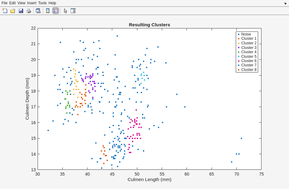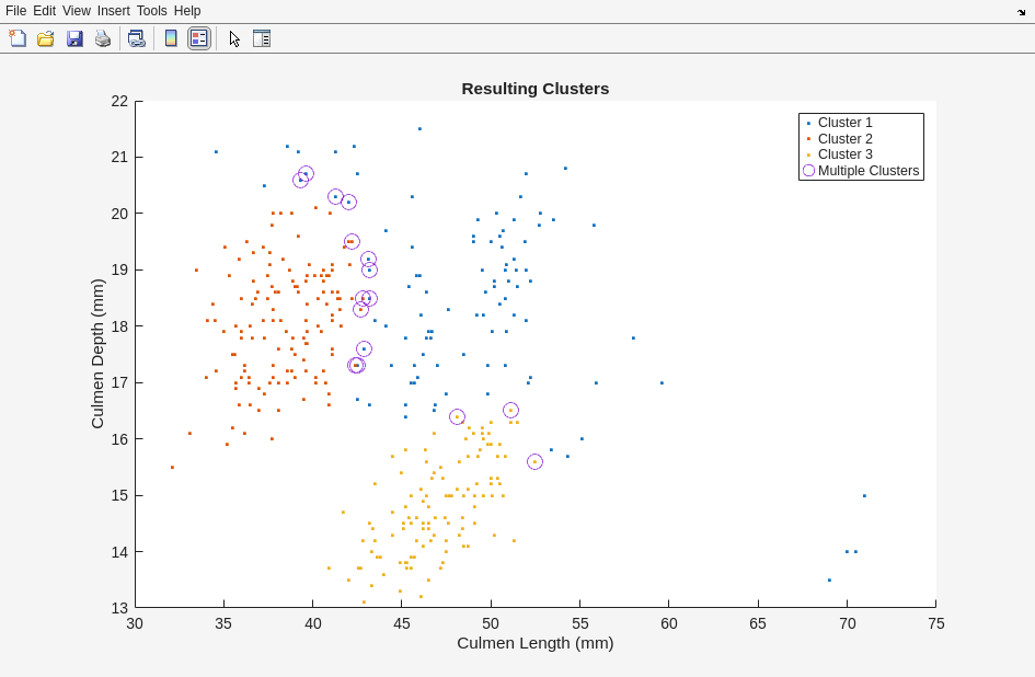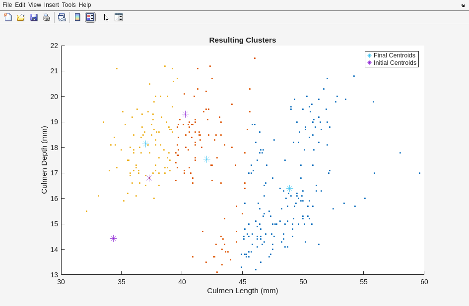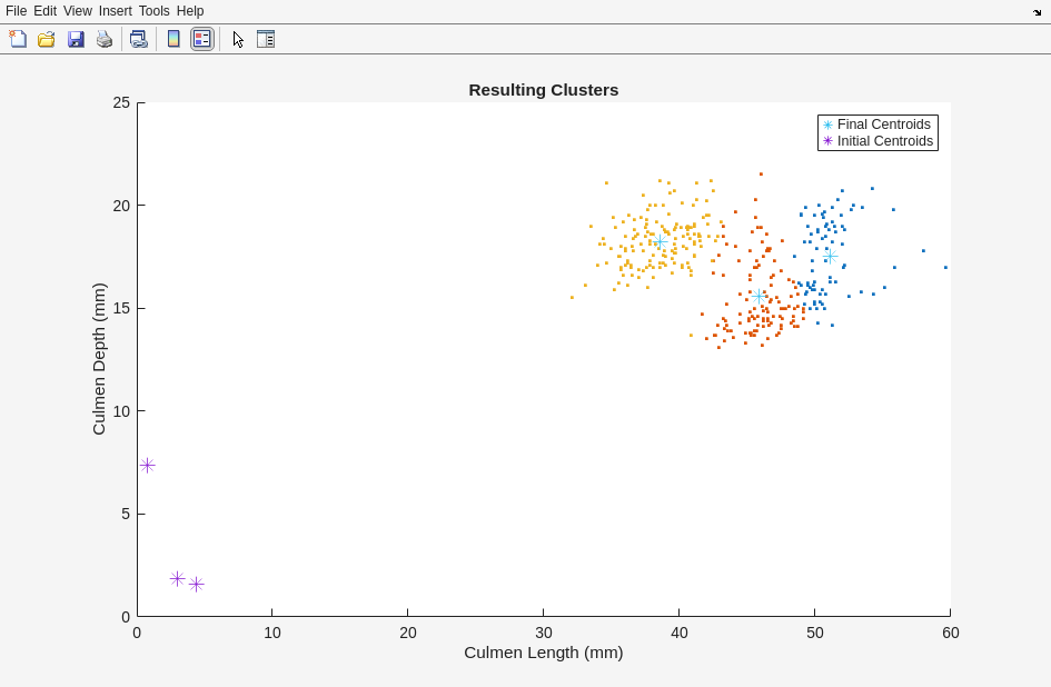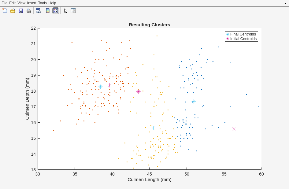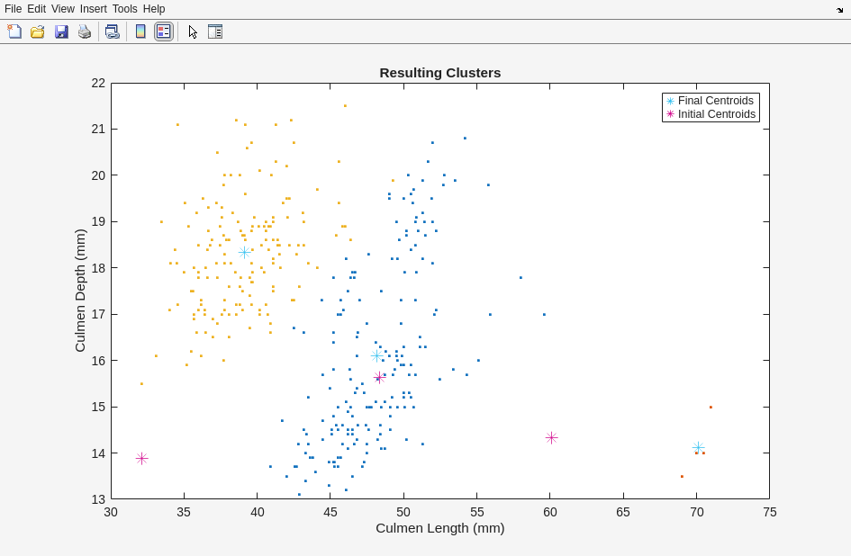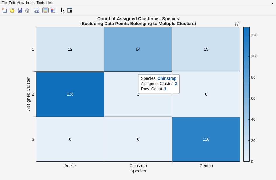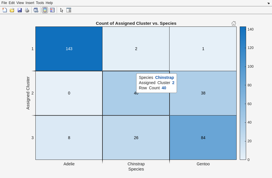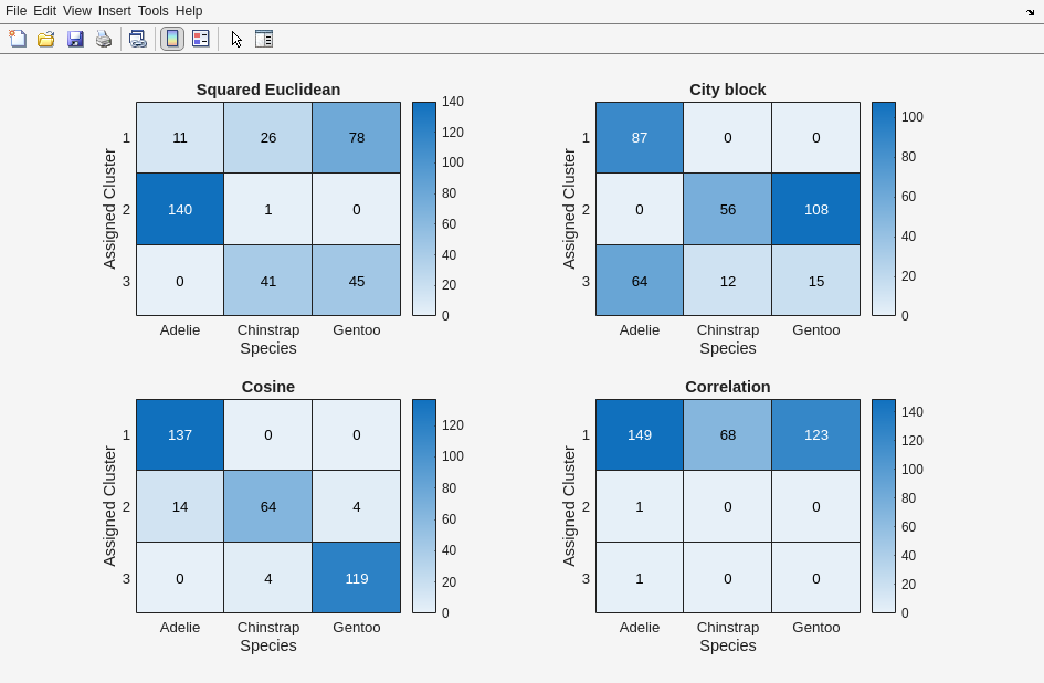Running SmokeTests >> Running ClusteringIntro.mlx Try again. Which data sets seem to have separable clusters? UnlabeledData = 344×2 table CulmenLength_mm_ CulmenDepth_mm_ ________________ _______________ 39.1 18.7 39.5 17.4 40.3 18 NaN NaN 36.7 19.3 39.3 20.6 38.9 17.8 39.2 19.6 34.1 18.1 42 20.2 37.8 17.1 37.8 17.3 41.1 17.6 38.6 21.2 34.6 21.1 36.6 17.8 38.7 19 42.5 20.7 34.4 18.4 46 21.5 37.8 18.3 37.7 18.7 35.9 19.2 38.2 18.1 38.8 17.2 35.3 18.9 40.6 18.6 40.5 17.9 37.9 18.6 40.5 18.9 39.5 16.7 37.2 18.1 39.5 17.8 40.9 18.9 36.4 17 39.2 21.1 38.8 20 42.2 18.5 37.6 19.3 39.8 19.1 36.5 18 40.8 18.4 36 18.5 44.1 19.7 37 16.9 39.6 18.8 41.1 19 37.5 18.9 36 17.9 42.3 21.2 39.6 17.7 40.1 18.9 35 17.9 42 19.5 34.5 18.1 41.4 18.6 39 17.5 40.6 18.8 36.5 16.6 37.6 19.1 35.7 16.9 41.3 21.1 37.6 17 41.1 18.2 36.4 17.1 41.6 18 35.5 16.2 41.1 19.1 35.9 16.6 41.8 19.4 33.5 19 39.7 18.4 39.6 17.2 45.8 18.9 35.5 17.5 42.8 18.5 40.9 16.8 37.2 19.4 36.2 16.1 42.1 19.1 34.6 17.2 42.9 17.6 36.7 18.8 35.1 19.4 37.3 17.8 41.3 20.3 36.3 19.5 36.9 18.6 38.3 19.2 38.9 18.8 35.7 18 41.1 18.1 34 17.1 39.6 18.1 36.2 17.3 40.8 18.9 38.1 18.6 40.3 18.5 33.1 16.1 43.2 18.5 35 17.9 41 20 37.7 16 37.8 20 37.9 18.6 39.7 18.9 38.6 17.2 38.2 20 38.1 17 43.2 19 38.1 16.5 45.6 20.3 39.7 17.7 42.2 19.5 39.6 20.7 42.7 18.3 38.6 17 37.3 20.5 35.7 17 41.1 18.6 36.2 17.2 37.7 19.8 40.2 17 41.4 18.5 35.2 15.9 40.6 19 38.8 17.6 41.5 18.3 39 17.1 44.1 18 38.5 17.9 43.1 19.2 36.8 18.5 37.5 18.5 38.1 17.6 41.1 17.5 35.6 17.5 40.2 20.1 37 16.5 39.7 17.9 40.2 17.1 40.6 17.2 32.1 15.5 40.7 17 37.3 16.8 39 18.7 39.2 18.6 36.6 18.4 36 17.8 37.8 18.1 36 17.1 41.5 18.5 46.5 17.9 50 19.5 51.3 19.2 45.4 18.7 52.7 19.8 45.2 17.8 46.1 18.2 51.3 18.2 46 18.9 51.3 19.9 46.6 17.8 51.7 20.3 47 17.3 52 18.1 45.9 17.1 50.5 19.6 50.3 20 58 17.8 46.4 18.6 49.2 18.2 42.4 17.3 48.5 17.5 43.2 16.6 50.6 19.4 46.7 17.9 52 19 50.5 18.4 49.5 19 46.4 17.8 52.8 20 40.9 16.6 54.2 20.8 42.5 16.7 51 18.8 49.7 18.6 47.5 16.8 47.6 18.3 52 20.7 46.9 16.6 53.5 19.9 49 19.5 46.2 17.5 50.9 19.1 45.5 17 50.9 17.9 50.8 18.5 50.1 17.9 49 19.6 51.5 18.7 49.8 17.3 48.1 16.4 51.4 19 45.7 17.3 50.7 19.7 42.5 17.3 52.2 18.8 45.2 16.6 49.3 19.9 50.2 18.8 45.6 19.4 51.9 19.5 46.8 16.5 45.7 17 55.8 19.8 43.5 18.1 49.6 18.2 50.8 19 50.2 18.7 46.1 13.2 50 16.3 48.7 14.1 50 15.2 47.6 14.5 46.5 13.5 45.4 14.6 46.7 15.3 43.3 13.4 46.8 15.4 40.9 13.7 49 16.1 45.5 13.7 48.4 14.6 45.8 14.6 49.3 15.7 42 13.5 49.2 15.2 46.2 14.5 48.7 15.1 50.2 14.3 45.1 14.5 46.5 14.5 46.3 15.8 42.9 13.1 46.1 15.1 44.5 14.3 47.8 15 48.2 14.3 50 15.3 47.3 15.3 42.8 14.2 45.1 14.5 59.6 17 49.1 14.8 48.4 16.3 42.6 13.7 44.4 17.3 44 13.6 48.7 15.7 42.7 13.7 49.6 16 45.3 13.7 49.6 15 50.5 15.9 43.6 13.9 45.5 13.9 50.5 15.9 44.9 13.3 45.2 15.8 46.6 14.2 48.5 14.1 45.1 14.4 50.1 15 46.5 14.4 45 15.4 43.8 13.9 45.5 15 43.2 14.5 50.4 15.3 45.3 13.8 46.2 14.9 45.7 13.9 54.3 15.7 45.8 14.2 49.8 16.8 46.2 14.4 49.5 16.2 43.5 14.2 50.7 15 47.7 15 46.4 15.6 48.2 15.6 46.5 14.8 46.4 15 48.6 16 47.5 14.2 51.1 16.3 45.2 13.8 45.2 16.4 49.1 14.5 52.5 15.6 47.4 14.6 50 15.9 44.9 13.8 50.8 17.3 43.4 14.4 51.3 14.2 47.5 14 52.1 17 47.5 15 52.2 17.1 45.5 14.5 49.5 16.1 44.5 14.7 50.8 15.7 49.4 15.8 46.9 14.6 48.4 14.4 51.1 16.5 48.5 15 55.9 17 47.2 15.5 49.1 15 47.3 13.8 46.8 16.1 41.7 14.7 53.4 15.8 43.3 14 48.1 15.1 50.5 15.2 49.8 15.9 43.5 15.2 51.5 16.3 46.2 14.1 55.1 16 44.5 15.7 48.8 16.2 47.2 13.7 NaN NaN 46.8 14.3 50.4 15.7 45.2 14.8 49.9 16.1 Cluster centers have been randomized! Cluster centers have been randomized! Try again. Which distance metric resulted in the data being clustered the most accurately? [Terse] Diagnostic logged (2025-10-06 12:06:55): Figure saved to: --> /tmp/eea3fade-3b87-4aed-b401-15faa369d1f9/Figure_93ae73c9-7d2f-4091-ae32-fbcd17eb390c.png [Terse] Diagnostic logged (2025-10-06 12:07:05): Figure saved to: --> /tmp/eea3fade-3b87-4aed-b401-15faa369d1f9/Figure_300b7d41-4f3a-4c92-8efc-e23c7f7d2fa3.png [Terse] Diagnostic logged (2025-10-06 12:07:05): Figure saved to: --> /tmp/eea3fade-3b87-4aed-b401-15faa369d1f9/Figure_5f4e79d4-e26e-4844-a674-d5cd3022a2da.png [Terse] Diagnostic logged (2025-10-06 12:07:06): Figure saved to: --> /tmp/eea3fade-3b87-4aed-b401-15faa369d1f9/Figure_6811c3aa-0b1f-4d78-b551-2b07e459a4c9.png [Terse] Diagnostic logged (2025-10-06 12:07:06): Figure saved to: --> /tmp/eea3fade-3b87-4aed-b401-15faa369d1f9/Figure_08f8d4cf-cf04-4479-9e07-5cbdaaa86e4d.png .>> Running ClusteringMethods.mlx Try again. If you are struggling, try drawing the problem out on paper and working through the steps by hand, labeling the data points as you go. Mean1 = 0.5000 4.0000 Mean2 = 1.0000 4.5000 Covariance1 = 1 0 0 1 Covariance2 = 1 0 0 1 Weight1 = 0.5000 Weight2 = 0.5000 WeightedPDFCluster1 = 0.0035 WeightedPDFCluster2 = 0.0021 Probability of belonging to assigned cluster = 0.0035 / (0.0035 + 0.0021) = 0.62246 Mean1 = 1.5000 1.5000 Mean2 = 3.2500 3.0000 Covariance1 = 0.5774 0 0 0.5774 Covariance2 = 0.9574 0 0 0.8165 Weight1 = 0.5000 Weight2 = 0.5000 Try again. Which cluster's values are closer to its centroid? SSE for cluster 1: 19.117547SSE for cluster 2: 2.728535Average Silhouette value for cluster 1: 0.744809Average Silhouette value for cluster 2: 0.970013Davies-Bouldin criterion for 2 clusters: 0.373374Davies-Bouldin criterion for 3 clusters: 0.742861Davies-Bouldin criterion for 4 clusters: 0.595582 [Terse] Diagnostic logged (2025-10-06 12:07:20): Figure saved to: --> /tmp/eea3fade-3b87-4aed-b401-15faa369d1f9/Figure_1be7e15c-f27e-402c-8ece-b6f4a76e8e1f.png [Terse] Diagnostic logged (2025-10-06 12:07:28): Figure saved to: --> /tmp/eea3fade-3b87-4aed-b401-15faa369d1f9/Figure_197e42e1-8546-458a-b93e-5968c9262d60.png [Terse] Diagnostic logged (2025-10-06 12:07:28): Figure saved to: --> /tmp/eea3fade-3b87-4aed-b401-15faa369d1f9/Figure_9893e376-b46f-4735-8d6e-bae1330782bf.png [Terse] Diagnostic logged (2025-10-06 12:07:29): Figure saved to: --> /tmp/eea3fade-3b87-4aed-b401-15faa369d1f9/Figure_6de00a72-9